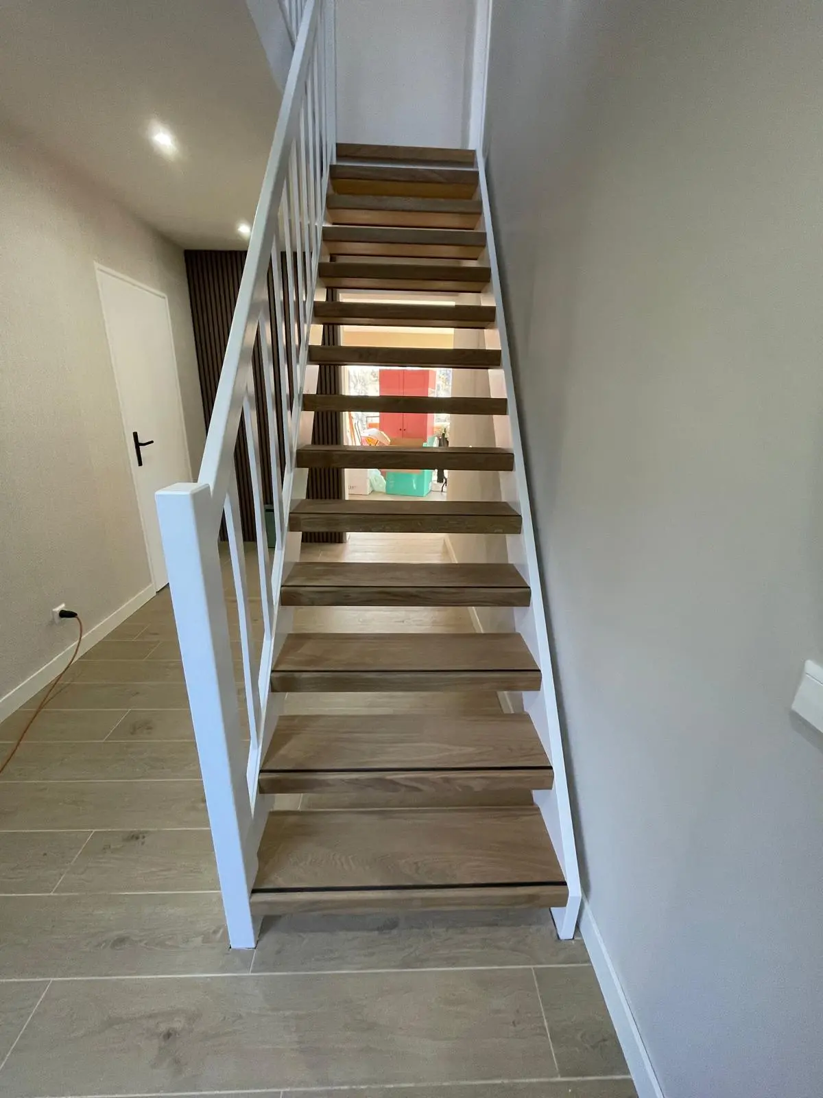 Binnen één dag transformeren we je trap met duurzame eikenhouten bekleding en een strakke afwerking.